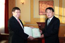 Ulaanbaatar /MONTSAME/ The Vice Minister for Foreign Affairs of Mongolia, Mr D.Gankhuyag has presented a title of Cultural Honorary Envoy of Mongolia to S.Korean citizen Kim Kwang Shin.<