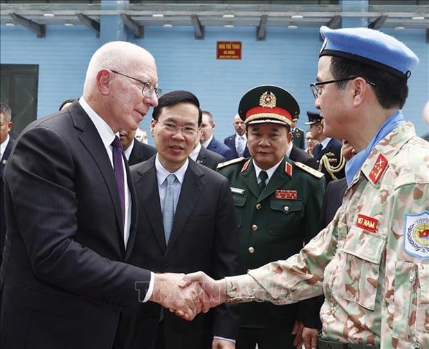 Hanoi, April 5 (VNA) – Australian Governor-General David Hurley praised the Vietnamese blue beret force’s contributions and stressed the meaning of the Vietnam-Australia cooperation in the UN's peacekeeping mission when he and President Vo Van Thuong visited the headquarters of the Vietnam Department of Peacekeeping Operations in Hanoi on April 4.