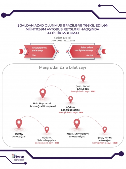 To date, 114 trips have been made on regular bus routes, commissioned on 24 January to the territories liberated from occupation by the State Road Transport Service under the Ministry of Digital Development and Transport, and 4,448 people have visited Shusha and Aghdam.
