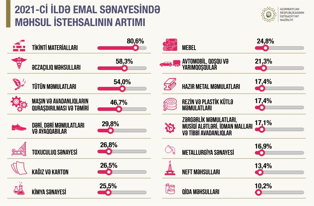 “Measures aimed at strengthening the industrial potential of Azerbaijan are yielding positive results,” Minister of Economy Mikayil Jabbarov said on Twitter.
