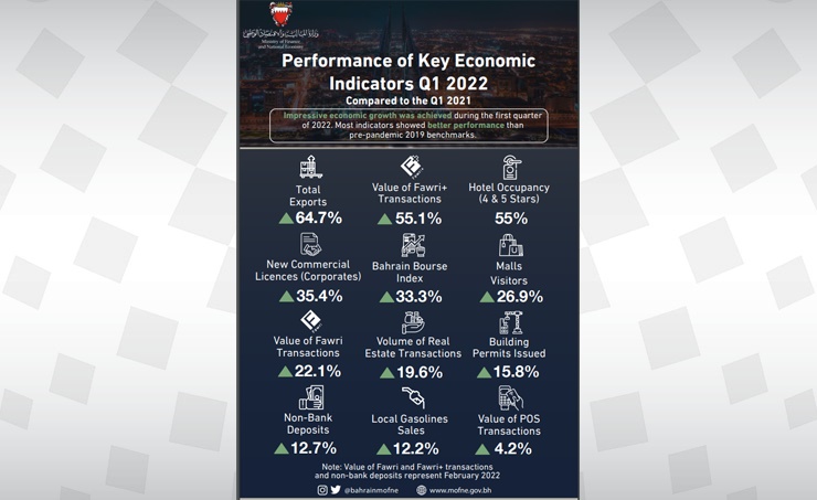 In the financial services sector, remarkable growth was achieved in February. Fawri+ transactions grew by 55.1% and Fawri transactions increased by 22.1%. Similarly, total non-bank deposits grew by 12.7% and the Bahrain Bourse index witnessed a 33.3% increase.