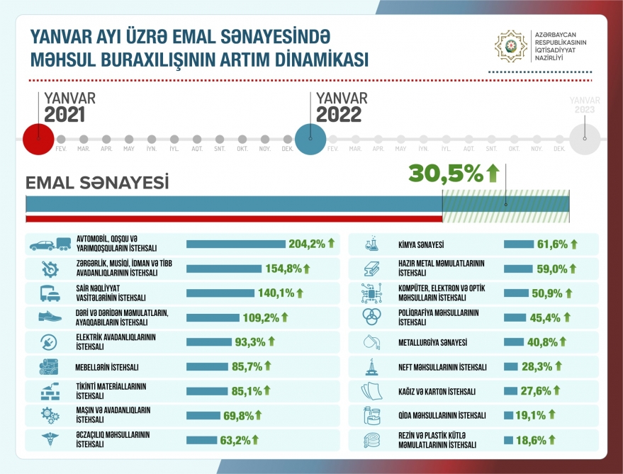 “In January this year, production in the processing industry increased by 30.5%, compared to the same month last year,” Azerbaijani Minister of Economy Mikayil Jabbarov posted on Twitter.