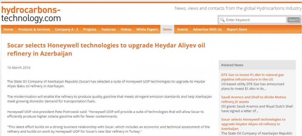 Hydrocarbons Technology website has published an article titled “SOCAR selects Honeywell technologies to upgrade Heydar Aliyev oil refinery in Azerbaijan”.