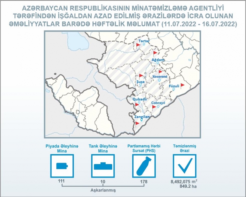 “During the mine-clearing operations in Tartar, Aghdam, Shusha, Khojavand, Fuzuli, Gubadli, Jabrayil and Zangilan districts 111 anti-personnel and 10 anti-tank mines, as well as 178 unexploded ordnances (UXOs) were found and neutralized from July 11 to 16,” Azerbaijan’s Mine Action Agency said in a statement.