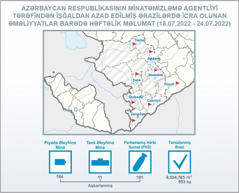 “During the mine-clearing operations in Tartar, Aghdam, Shusha, Khojavand, Fuzuli, Gubadli, Jabrayil and Zangilan districts 184 anti-personnel and 11 anti-tank mines, as well as 181 unexploded ordnances (UXOs) were found and neutralized from July 18 to 24,” Azerbaijan’s Mine Action Agency said in a statement.