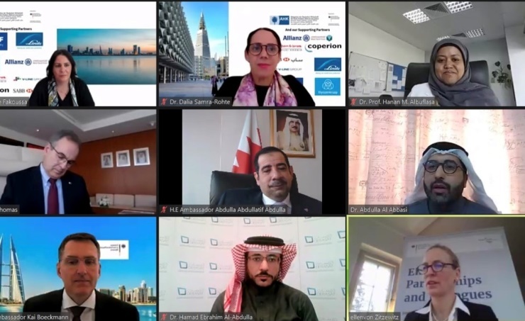 Manama, Feb. 10 (BNA): Ambassador of the Kingdom of Bahrain to the Federal Republic of Germany, Abdullah Abdullatif Abdullah, participated virtually in a symposium on the energy transition in the Kingdom of Bahrain -changes & challenges, which was organised by the German-Saudi Arabian Liaison Office for Economic Affairs (GESALO). During the symposium, an overview of the current situation and opportunities for cooperation between the Kingdom of Bahrain and the Federal Republic of Germany in the field of renewable energy and energy efficiency, climate change commitments, tools for regulatory support plans and upcoming initiatives were reviewed. Present in the symposium were Kai Bochmann, the Ambassador of the Federal Republic of Germany to the Kingdom of Bahrain, and Elaine Von, the Deputy Director of the International Cooperation Department at the German Federal Ministry for Economic Affairs and Energy. Also participating were Dr. Hamad Ibrahim Al-Abdullah and Dr. Abdullah Al-Abbasi, from Bahrain Centre for Strategic Studies and Energy (Derasat), CEO of Nogaholding Group, Mark Thomas, and Head of Physics Department, University of Bahrain Dr. Hanan Al Buflasa.
