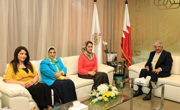 Manama, Sept.18 (BNA): University of Bahrain (UoB) President Dr. Riyadh Youssef Hamaza received at Sakhir Campus Sultan Qaboos University Assistant President for International Cooperation Her Highness Dr. Mona bint Fahd bin Humood Al-Said and the accompanying delegation.