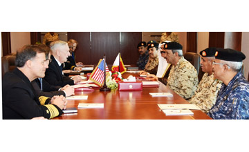 Manama, Mar.14 (BNA): Bahrain Defence Force (BDF) Commander in Chief Field Marshal Shaikh Khalifa bin Ahmed Al-Khalifa today received US Defence Secretary James Mattis at the BDF Officers’ Club. The Minister of Defence Affairs Lieutenant-General Youssef bin Ahmed Al-Jalahma and the BDF Chief of Staff Lt. Gen. Dhiyab bin Saqr Al-Nuaimi attended. The BDF Chief welcomed the US Defence Secretary and the accompanying delegation, hailing deep-rooted historic relations binding the two countries, as well as growing military cooperation. The two sides exchanged commemorative mementos. Field Marshal Shaikh Khalifa bin Ahmed Al-Khalifa hosted a lunch banquet in honour of the US Defence Secretary at the BDF Officers’ Club.