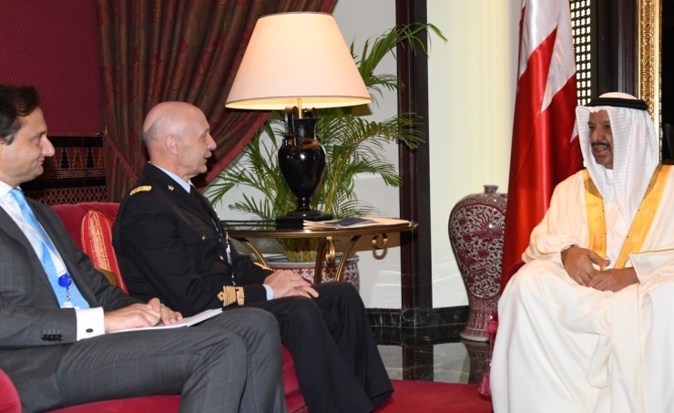 Manama, Nov. 23 (BNA): Commander-in-Chief of Bahrain Defence Force (BDF) Field Marshal Shaikh Khalifa bin Ahmed Al Khalifa received at the Ritz Carlton Hotel today Chief of Staff of the Italian Armed Forces Lt.Gen Enzo vecciarelli and his accompanying delegation on the occasion of his visit to Bahrain to participate in the 15th edition of the IISS Manama Dialogue. The meeting was attended by Defence Minister Lieutenant General Abdullah bin Hassan Al Nuaimi and Chief of Staff Lieutenant General Dhiab bin Saqr Al Nuaimi. The BDF Commander-in-Chief welcomed the Italian Chief of Staff, lauding friendly relations between the Kingdom of Bahrain and Italy. They discussed ways of boosting bilateral relations and issues of common interest. Present at the meeting were General Command Court Director Major General Hassan Mohammed Sa’ad, Assistant Chief of Staff for Supply and Catering Rear Admiral Yusef Ahmed Malallah, Military Cooperation Director Rear Admiral Mohammed Hashim Al Sadah and BDF senior officers.