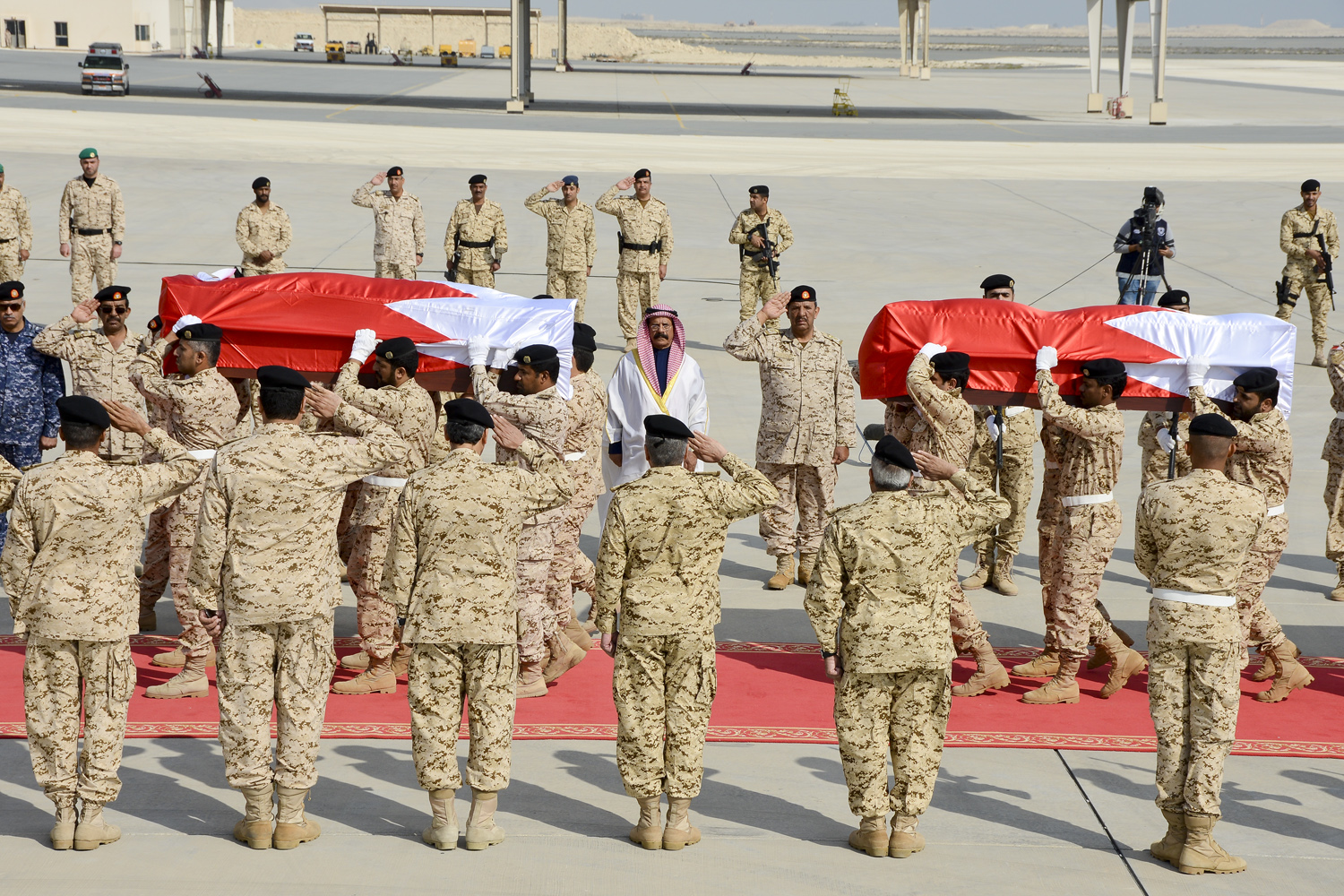 Manama, Dec.30 (BNA): Bahrain Defence Force (BDF) Commander-in-Chief Field Marshal Shaikh Khalifa bin Ahmed Al-Khalifa was at the forefront as the bodies of BDF servicemen Captain Ahmed Mohammed Ameen, Captain Mubarak Saad Al-Rumaihi and First Sergeant Hassan Ali Eskandar Majid arrived this afternoon in Isa Airbase, aboard a Royal Bahrain Air force (RBAF) military jet, accompanied by a number of BDF officers.