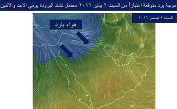 Manama, Dec. 31 (BNA): The Bahrain Meteorological Directorate (BMD) forecasts a cold spell, partly cloudy and stormy weather to prevail in the kingdom as from Friday and lasting until Monday with a chance of downpours associated with high speed winds. The Directorate cautioned from strong, high-speed winds and urged everyone, especially seafarers, to take the necessary precautions. The Directorate said the winds will range between light and moderate southeasterly directional, later transforming into active, high-speed northwesterly winds.