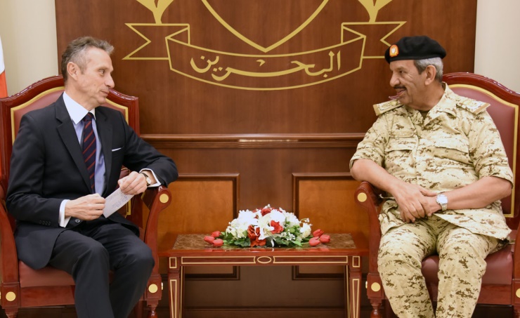 Manama, Nov. 20 (BNA): The BDF Commander-in-Chief Field Marshal Shaikh Khalifa bin Ahmed Al Khalifa received Ambassador of France to Bahrain, Jerome Cauchard. They discussed topics pertaining to boosting the amicable ties as well as ongoing cooperation and coordination, wishing the ambassador success. BDF General Headquarters Director Major-General Hassan Mohamed Sa'ad; and, Military Cooperation Director (Naval) Rear Admiral Mohamed Hashem Al-Sada, were also present.