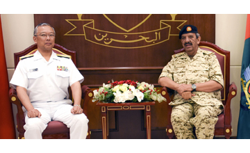 Manama, June 3 (BNA): Commander-in-Chief of Bahrain Defence Force (BDF), Field Marshal Shaikh Khalifa bin Ahmed Al Khalifa received Japanese Maritime Self-Defense Force Chief of Staff ,Admiral Yutaka Murakawa and his accompanying delegation. In the presence of Minister of Defence Affairs, Lieutenant-General Yousuf bin Ahmed Al Jalahma, BDF Chief of Staff, Lt-General Dhiyab bin Saqr Al-Nuaimi.