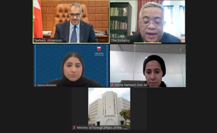 Manama, June 1 (BNA): Undersecretary for Consular and Administrative Affairs at the Ministry of Foreign Affairs, Ambassador Tawfeeq Ahmed Al-Mansoor, held a virtual meeting today with the Ambassador of the Kingdom of Thailand to the Kingdom of Bahrain, Thanis Na Songkhla. Ambassador Tawfeeq praised the close relations between the Kingdom of Bahrain and the friendly Kingdom of Thailand, and the distinguished level they have reached in all fields, stressing Bahrain's constant keenness to develop various aspects of joint cooperation between the two countries in a way that serves their interests. He wished the Thai Ambassador continued success. The Thai Ambassador commended the notable level of friendship and cooperation between the two countries and their constant growth and development, stressing his country's keenness to consolidate these relations in a way that would benefit both countries. He wished the Kingdom of Bahrain continued progress and prosperity. The two sides also discussed a number of issues of common concern.
