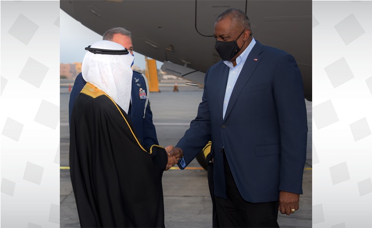 Manama, Nov. 19 (BNA): Minister of Defence Affairs, Lieutenant General Abdullah bin Hassan Al Nuaimi, received today the US Secretary of Defence, Lloyd J. Austin, on arrival at Bahrain International Airport to participate in Manama Dialogue 2021 forum. The Minister of Defence welcomed him, wishing him a good stay in the Kingdom of Bahrain.