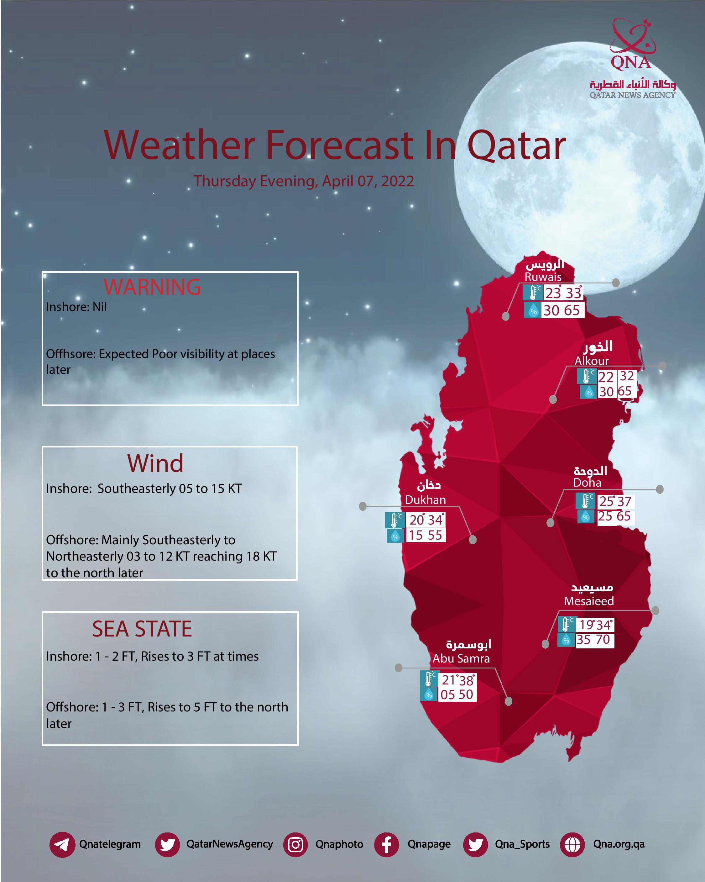 Doha, April 07 (QNA) - Weather inshore tonight until 6:00 am on Friday will be hazy at times, Department of Meteorology said in its daily weather report. Offshore, it will be hazy to misty with chance of fog at places later and poor visibility at places later, the report added. Wind inshore will be southeasterly at a speed of 05 to 15 knot. Offshore, it will be mainly southeasterly to northeasterly at a speed of 03 to 12 knot reaching to 18 knots to the north later. Visibility will be 04 to 08 kilometers. Sea state inshore will be 1 to 2 feet surging to 3 feet at times. Offshore, it will be 1 to 3 feet, surging to 5 feet to the north later. (QNA)