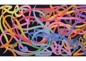 Although acquainted with the subtlety of traditional Iranian calligraphy, Ahmadian’s use of bright, bold colors are more akin to painting, which gives his works harmonious compositions.