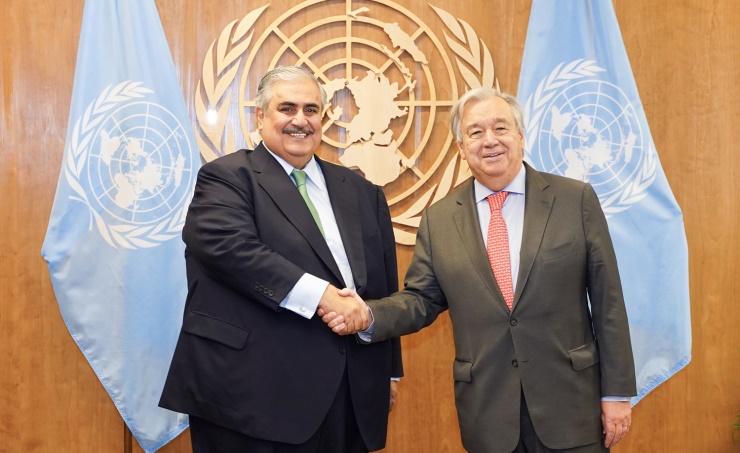 New York, Sept. 28 (BNA): The Minister of Foreign Affairs, Shaikh Khalid bin Ahmed bin Mohammed Al Khalifa, conveyed the greetings of His Majesty King Hamad bin Isa Al Khalifa, His Royal Highness the Prime Minister, Prince Khalifa bin Salman Al Khalifa and His Royal Highness the Crown Prince, Deputy Supreme Commander and First Deputy Prime Minister, Prince Salman bin Hamad Al Khalifa, to the Secretary-General of the United Nations, António Guterres, and their wishes to him of further success in leading the United Nations. This came as the Minister of Foreign Affairs met with the Secretary-General on the sidelines of the 74th Session of the United Nations General Assembly in New York. The UN Secretary-General noted the Kingdom’s policy of cooperation with the United Nations and its vital role in preserving peace and security in the region. For his part, Shaikh Khalid hailed the efforts of the UN Secretary-General to develop the work of the organization on peace and security, sustainable development, and other issues and challenges facing the countries of the world. He reiterated the Kingdom’s solidarity with the Secretary-General’s endeavors to achieve a more prosperous future for all countries, wishing him further success.