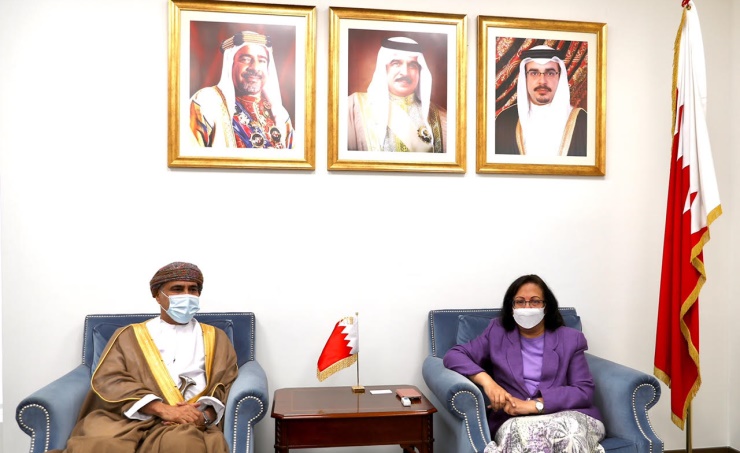 Manama, Aug. 5 (BNA): Health Minister, Faeqa bint Said Al-Saleh, today received the outgoing Omani Ambassador to Bahrain, Abdulla bin Rashid Al-Mudailawi. The minister affirmed the solid deep-rooted relations between the two brotherly countries in all fields, commending the good efforts exerted by the envoy throughout his tenure. The ambassador conveyed to the Minister of Health the greetings of her Omani counterpart, lauding the kingdom’s efforts and initiatives to combat the novel Coronavirus pandemic, citing the outstanding success of the National Vaccination Campaign and the adoption of the COVID-19 Alert Level Traffic Light System based on COVID-19 positivity rates. He also hailed the distinguished performance of the Bahraini medical competencies and the recommendations issued by the National Medical Taskforce and Team Bahrain, led by His Royal Highness Prince Salman bin Hamad Al Khalifa, the Crown Prince and Prime Minister. The envoy also congratulated the Health Minister on the successful visit of the Secretary-General of the World Health Organisation (WHO), Dr Tedros Adhanom Ghebreyesus, to the kingdom, noting that the visit yielded positive results, both at the local and international levels. The two sides discussed health topics of mutual concern, in addition to ways to enhance Bahraini-Omani cooperation.