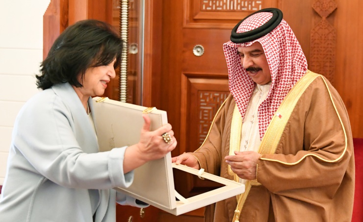 Manama, Feb. 18 (BNA): His Majesty King Hamad bin Isa Al Khalifa received at Safriyah Palace today President of Bahrain Authority for Culture and Antiquities (BACA) Shaikha Mai bint Mohammed Al Khalifa who presented him with a copy of the Holy Quran with a luxurious cover engraved with Islamic motifs and Arab calligraphy, which was printed by BACA as part of "Muharraq the Capital of Islamic Culture 2018" functions. Shaikha Mai also presented HM the King with a book (Investing in Culture) which documents the sponsors' contributions to Investing in Culture project which was launched by BACA and resulted in the construction of many cultural landmarks, including mainly Bahrain National Theatre that was set up thanks to a full sponsorship of HM the King. HM the King lauded the valuable publications, praising the efforts exerted by Bahrain Authority for Culture and Antiquities to preserve the national heritage and the kingdom's civilisational and cultural landmarks. He also commended the authority's efforts to enrich the cultural and literary movement, wishing Shaikha Mai and all the staff in the sector continuous success.