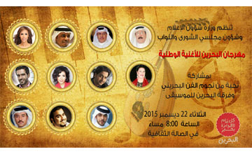 Manama, Dec 20 (BNA): Marking Bahrain's celebration of the National Day and Accession Day, on 22 December at the Cultural Hall, the Information and Parliament Affairs Ministry will organize an open house invitation to the 11th National Song Festival. An elite of Bahraini artists will perform local songs and will be escorted by Bahrain Music Band led by Maestro Khalifa Zeman. Artists participating in the festival are Ahmed Al-Jumairi; Mohammad Yusuf; Mohammad Al-Bikri; Hind, Najma Abdullah; Adil Mahmoud; Hanan Ridha; Waleed Jallal; Mohammad Al-Kaabi; Faisal Al-Ansari and Sameer Foni. The ministry, through this festival, is promoting the Bahraini artists by accentuating their artistic works.