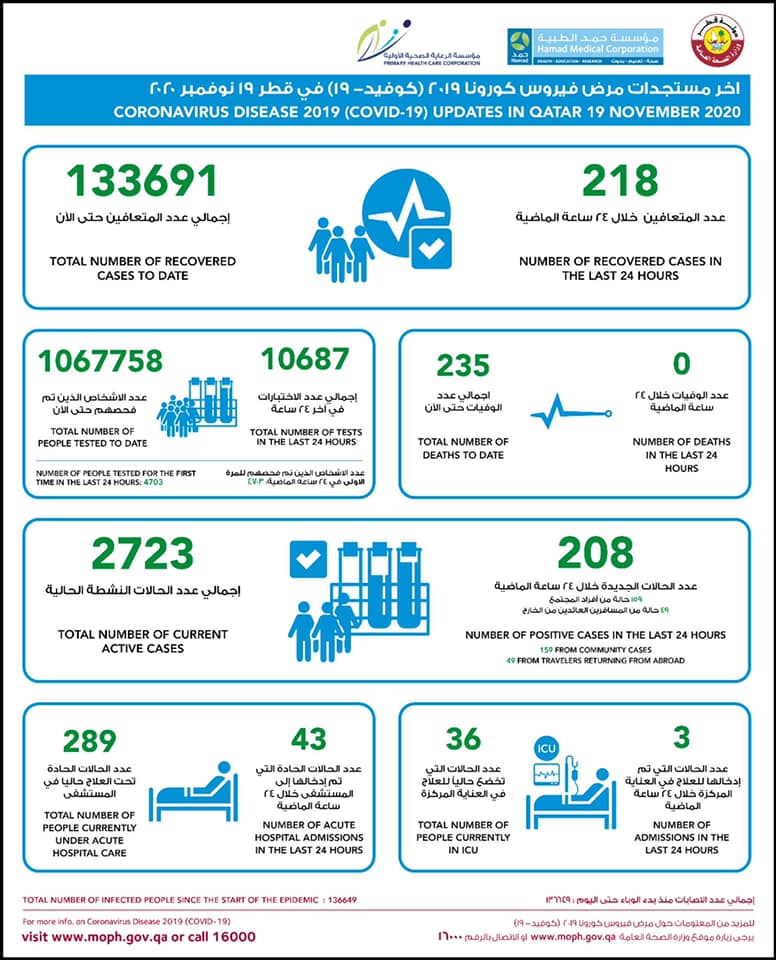 Doha, November 19 (QNA) - The Ministry of Public Health (MOPH) announced Thursday 208 new confirmed cases of coronavirus (COVID-19) during the last 24 hours, of which 159 are from community cases and 49 from travelers returning from abroad who are subject to quarantine.