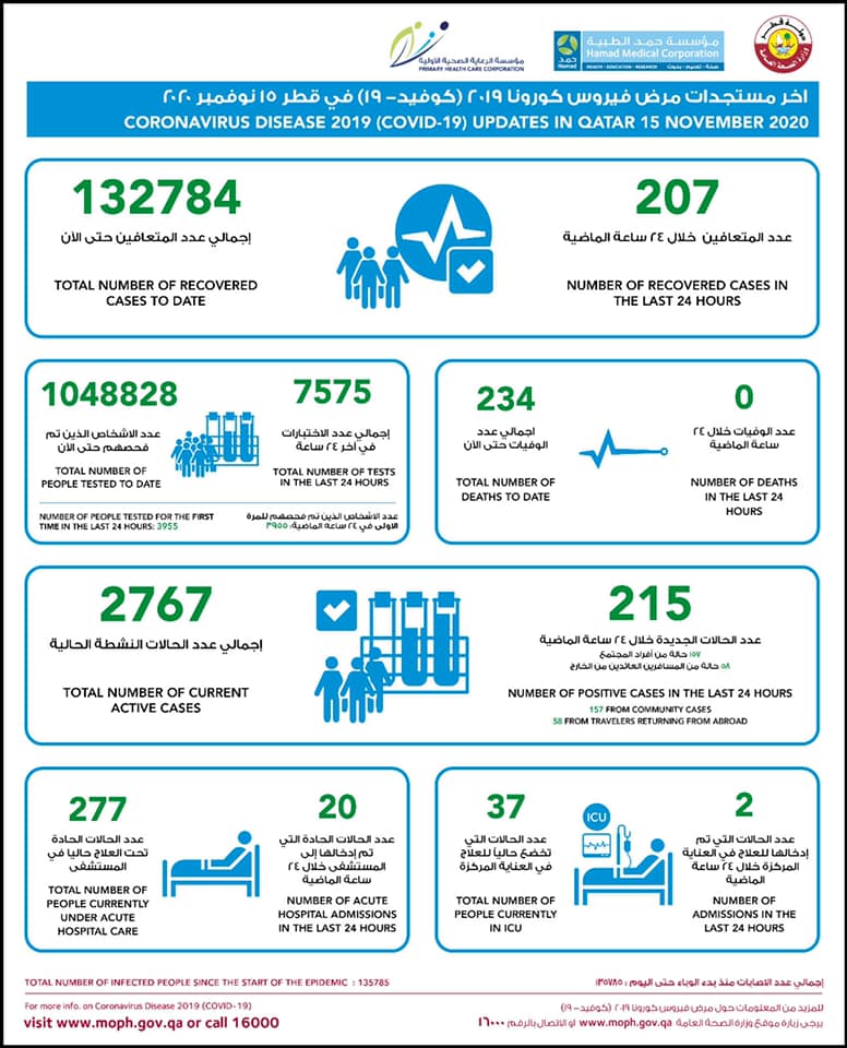 Doha, November 15 (QNA) - The Ministry of Public Health (MOPH) announced on Sunday 215 new confirmed cases of coronavirus (COVID-19) during the last 24 hours, of which 157 are from community cases and 58 from travelers returning from abroad who are subject to quarantine.