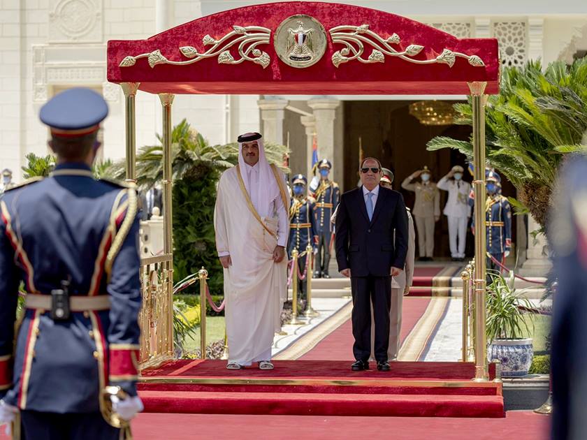 The ceremony began with the playing of the Qatari and Egyptian national anthems, after which HH the Emir reviewed the guard of honor, then His Highness shook hands with their Excellencies members of the Egyptian official delegation and senior officials. HE President of the Arab Republic of Egypt shook hands with their Excellencies members of the official delegation accompanying HH the Amir.(QNA)