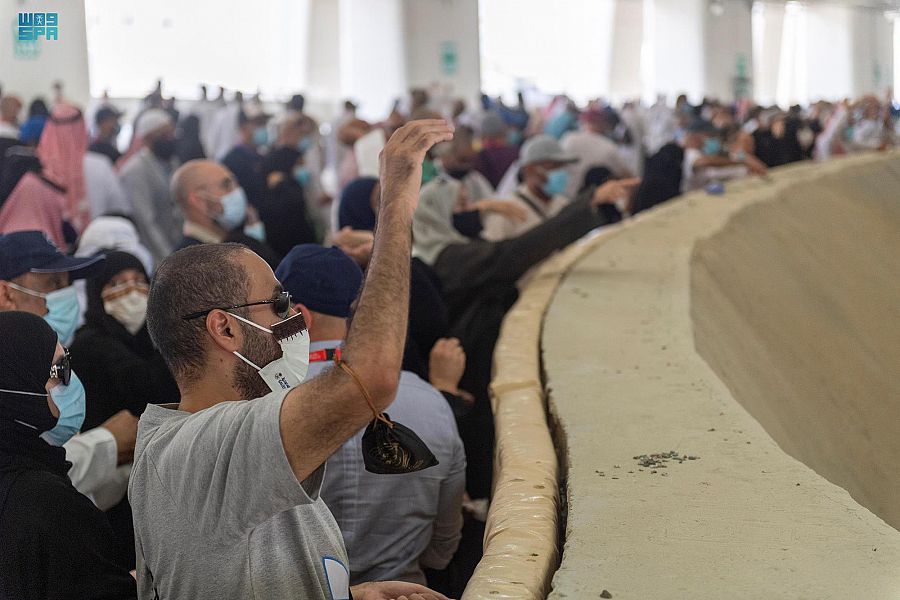Mina, July 22, 2021, SPA -- Pilgrims began the second day of Tashreeq by throwing the three Jamarat (Pebbles), under careful preparation and high precautionary measures, to achieve physical distancing between pilgrims and preserve their safety and the cadres involved in their services.