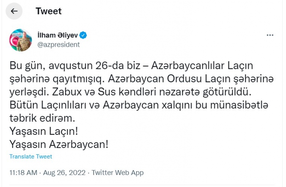 AZERTAC presents the post: “Today, on August 26, we – the Azerbaijanis - have returned to the city of Lachin. Azerbaijan’s Army is now stationed in the city of Lachin. The villages of Zabukh and Sus were taken under control.