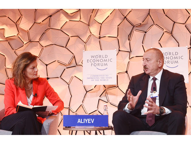 BAKU, Azerbaijan, Jan. 23 Trend: "We have a very broad agenda of reformswhich in the face of implementation will create better opportunities for our people," President of the Republic of Azerbaijan Ilham Aliyev said while responding to moderator's questions at a panel discussion on “Strategic Outlook: Eurasia” held as part of the World Economic Forum in Davos, Trend reports. "I think the most important now, especially taking into account the regional situation and new emerging conflict zones is the regional stability. We don’t have internal risks in the country whether it is political risks or economic risks, country is stable, development is sustainable. We have a very broad agenda of reforms which in the face of implementation will create better opportunities for our people. The main concern and the main potential nightmare would be aggravation of tension beyond our borders. And for that, unfortunately, we are not responsible, and we cannot to full degree influence that process. Responsibility lies on the super powers, on the big powers which must agree on certain issues between themselves so that this fragile stability is not shaken more," President Ilham Aliyev said. "We see those tensions close to our borders, we see tensions in Afghanistan we see unresolved situations there. We are ourselves subject of occupation by Armenia and this is a permanent source of threat, 20 percent of our territories are under Armenian occupation in violation of international norms and United Nations Security Council Resolutions. We see aggravation of tension with respect to US-Iranian relationship, and many other hotspots in the region which are already flaring our potential. Therefore, we are very interested in safety, security, and predictability beyond our borders, because even economic difficulties outside of Azerbaijan can influence our economic and social situation. Therefore, I think stability in the region is the main concern which we have, and instability in the region is the main nightmare if I may put it so," President Ilham Aliyev said.
