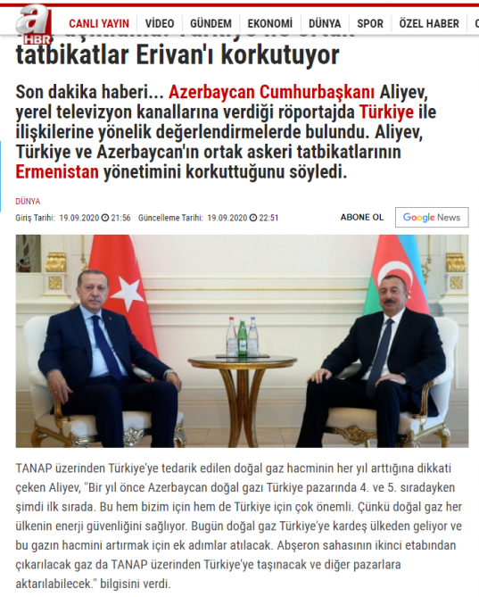 Turkish Anadolu Agency, Hurriyet, Milliyet, Sabah, Takvim and other popular newspapers, TRT HABER, TGRT, HABER TURK, A HABER, NTV TV channels, Russia's TASS, Interfax and RIA Novosti news agencies, "Lenta.ru", "News.ru", "Vesti Kavkaza", "Pravda.ru", "Moskovsky Komsomolets" and "Kommersant" newspapers, REN TV, TVC, 360 tv, EU’s information-analytical publication EU Politics, Egypt's Asyaelyoum and Aldiplomasy news agencies, Romania's News24hours, Ukraine's RBC-Ukraine, Kyrgyzstan's Goldenbridgenews, Georgia's Interpressnews, Dalgatv, 24news, News websites published articles and broadcast programs on President Ilham Aliyev`s interview.