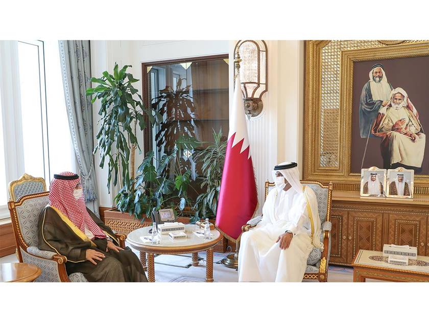 Doha, July 05 (QNA) - HE Prime Minister and Minister of Interior Sheikh Khalid bin Khalifa bin Abdulaziz Al-Thani met on Monday morning with HH Ambassador of the Kingdom of Saudi Arabia to the State of Qatar Prince Mansour bin Khalid bin Abdullah Al Farhan Al Saud. During the meeting, they reviewed relations between the two countries and ways of developing and strengthening them in various fields. (QNA)