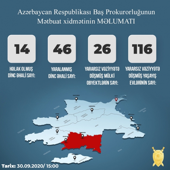 “As reported earlier, the military-political leadership of the aggressor Armenia continues to commit acts of terrorism against the civilian population, grossly violating the norms and principles of international law. 46 civilians have been hospitalized with various injuries, and 14 have been killed so far as a consequence of heavy artillery shelling of Azerbaijani densely populated areas,” press service of the Prosecutor General's Office of Azerbaijan told AZERTAC.
