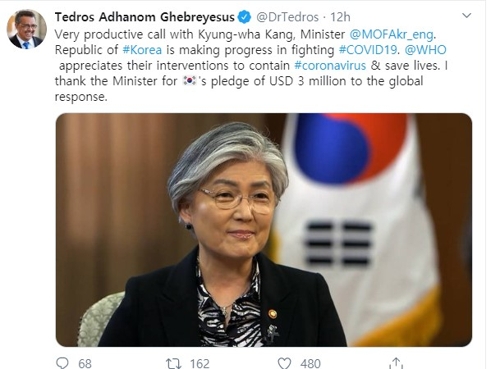 In a Twitter post Sunday, Tedros said Korea was "making progress" in its fight against the virus, expressing appreciation for "Seoul's interventions to contain the coronavirus and save lives."