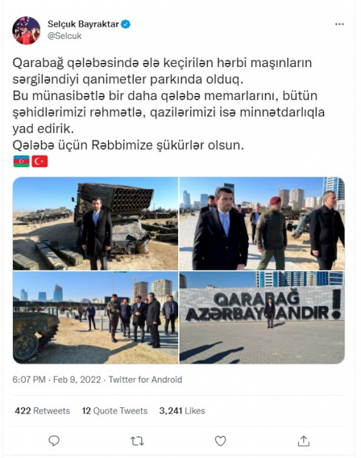 Baku, February 10, AZERTAC Chief Technology Officer of Turkey’s Baykar company and Chairman of the Board of TEKNOFEST Selcuk Bayraktar has visited the Military Trophy Park. "We visited the Military Trophy Park, where military equipment seized during the Karabakh war are demonstrated. On this occasion, we once again commemorate the architects of the Victory, all our martyrs, and honor our veterans with gratitude. Praise be to God for the victory," Bayraktar made a post on his Twitter account.