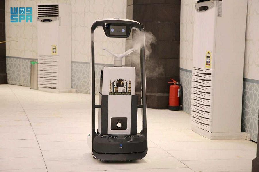 In this regard, the Environmental Protection and Epidemic Control Department at the General Presidency supported the intensified disinfection operations at the Grand Holy Mosque and its courtyards through providing robots. The robots use a control system that is programmed on a pre-installed map with six levels that contribute to protecting the environment and analyzing sterilization requirements according to various usage scenarios and course of sterilization.