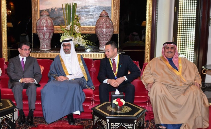 Manama, Nov. 24 (BNA): Southern Governor Shaikh Khalifa bin Ali Al Khalifa received, in the presence of Foreign Minister Shaikh Khalid bin Ahmed bin Mohammed Al Khalifa, Japanese Minister of Defence Tarō Kōno and Minister of State for Foreign Affairs Suzuki Keisuke, at the conclusion of the IISS Manama Dialogue 2019.