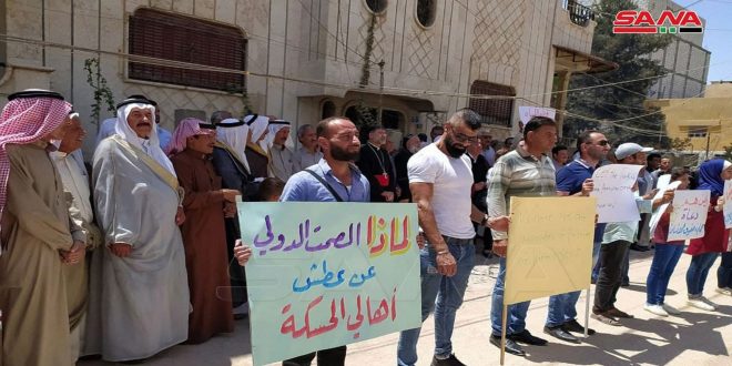 Hasaka, SANA- A number of Hasaka locals have participated in a stand in front of the office of the International Committee of the Red Cross (ICRC) in protest against the crime of cutting off drinking water to one million citizens in the province by the Turkish occupation.
