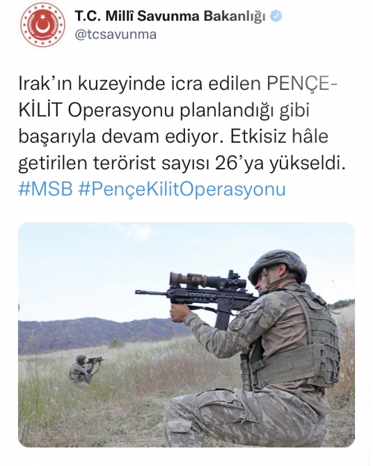 Baku, April 19, AZERTAC Turkish security forces "neutralized" a total of 26 PKK terrorists since the launch of Operation Claw-Lock in northern Iraq, the country’s National Defense Ministry said on Tuesday, Anadolu Agency reports. The anti-terror operation successfully continues as planned, the ministry said in a statement. According to the ministry, the new operation was launched on Monday after reports that the terrorist group was planning to initiate a large-scale attack, and it is in line with the UN Charter's principle of self-defense. PKK terrorists often hide out in northern Iraq to plot cross-border attacks in Turkiye. In 2020, Turkiye launched operations Claw-Tiger and Claw-Eagle in the border regions of northern Iraq to ensure the safety of the Turkish people and the frontiers.
