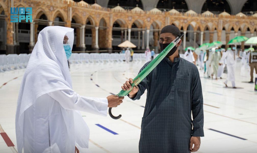 Makkah, July 16, 2021, SPA -- The General Presidency of Two Holy Mosques Affairs distributed today 12,000 umbrellas to worshipers and workers at the Grand Holy Mosque, as part of its initiative launched in preparation for this year’s Hajj season. The Director of Social Services Department at the General Presidency Janadi bin Ali Madkhali said that this falls within a package of initiatives offered by the Presidency to protects pilgrims, worshipers, workers and visitors of the Grand Holy Mosque from heat and ensure their safety. --SPA