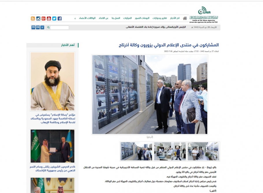 The Union of OIC News Agencies (UNA) has published an article highlighting the meeting held at the Azerbaijan State News Agency (AZERTAC) with the participation of foreign participants of the International Media Forum on "Global trends, news challenges in media”, organized by Azerbaijan’s Media Development Agency in Shusha.