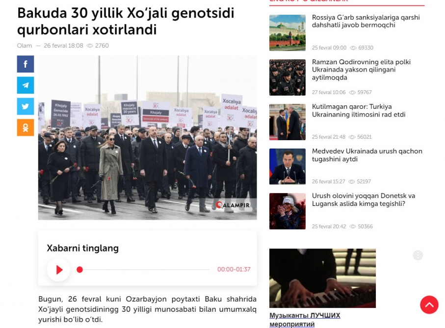 Uzbekistan`s xabar.uz, ziyouz.uz, qalampir.uz and azon.uz news portals have published articles commemorating the 30th anniversary of Khojaly genocide.