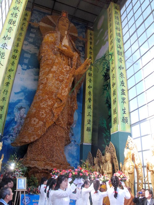 At the ceremony, Most Venerable Thich Tam Vi, Head of Linh Phuoc Pagoda said, the statue, 17 metres high, was build with around 650,000 flowers during 36 days on the occasion of the Da Lat Flower Festival 2010. It stands in front of a seven-storey bell tower.