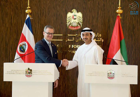 ABU DHABI, 19th May, 2016 (WAM) – H.H. Sheikh Abdullah bin Zayed Al Nahyan, Minister of Foreign Affairs and International Cooperation, has said that the UAE pays ample attention to economic and trade relations with Cost Rica. He added that the trade exchange between the two countries witnessed a continuous growth from US$3 million in 1999 to US$25 million in 2014. This was revealed in a joint statement issued after the meeting between Sheikh Abdullah and Minister of Foreign Affairs of the Republic of Costa Rica, Manuel Gonzalez Sanz, held at the ministry in Abu Dhabi. Sheikh Abdullah welcomed Sanz and extended thanks for the warm welcome accorded to him while visiting Costa Rica and meeting President of the Republic of Costa Rica, Luis Guillermo Solis, in the capital, San Jose. Sheikh Abdullah said, "During the visit, we had constructive discussions on a number of issues of common concern between the two friendly peoples. Here, in the UAE, we feel happy at the distinguished level of bilateral relations between the two countries, especially, yesterday after the signing of an agreement on mutual exemption from pre-entry visa requirements, to the holders of diplomatic and special passports, which is deemed an important step for strengthening bilateral relations." He stressed the desire of the two sides to develop co-operation at all avenues and fields, especially the food security, climate change, environment protection and renewable energy areas. He also hailed the positive stance of Costa Rica in these domains, hoping to see Costa Rica as an official member in the International Renewable Energy Agency (IRENA), based in Abu Dhabi. Sheikh Abdullah referred to the importance of signing the agreement on avoidance of double taxation and promotion and protection of investment agreements to enhance bilateral relations between the two countries. "Today, we discussed the role of the UAE in the food security issue and co-operation in this area with Costa Rica to export meat products and coffee to the UAE. Costa Rica is currently the frontrunner in the food security field and also a centre for approval of Halal products." For his part, Minister of Foreign Affairs of the Republic of Costa Rica praised the UAE-Costa Rican ties. The two ministers discussed the various existing co-operation relations between the UAE and Costa Rica and ways to boost them in the light of friendship and joint interests that the leaders of both countries aim to enhance. They also exchanged views on the latest regional and international developments. At the end of the meeting, Sheikh Abdullah and Sanz signed the agreement of mutual exemption from the pre-entry visa requirements for the holders of the diplomatic and special passports from the UAE and Costa Rica. – Emirates News Agency, WAM – http://www.wam.ae/en/news/emirates-international/1395295643672.html
