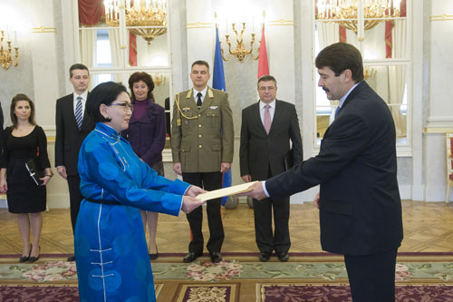 Ulaanbaatar, Mongolia /MONTSAME/ The Ambassador Plenipotentiary and Extraordinary of Mongolia to Hungary Ms T.Gandi handed over the credentials to Mr Janos Ader, the President of Hungary on October 26.
