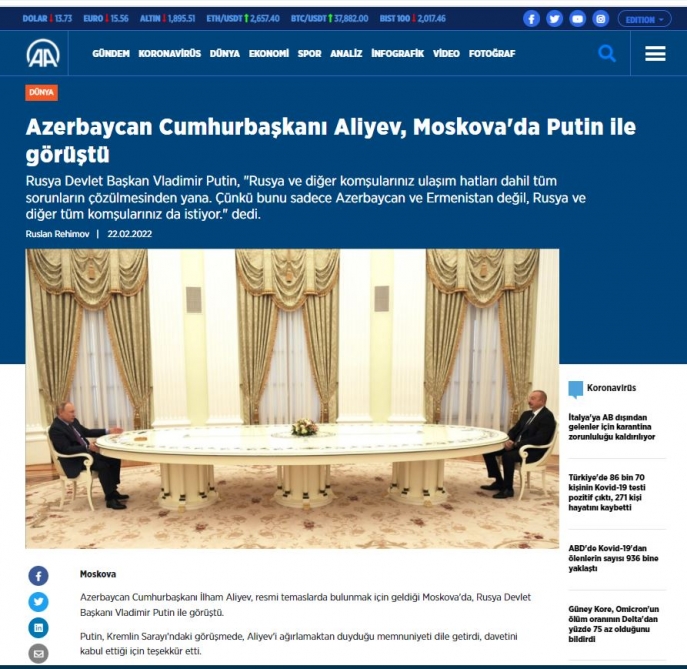 Ankara, February 23, AZERTAC Turkish Anadolu Agency has widely covered the official visit of President Ilham Aliyev to the Russian Federation and the signing of the Declaration on “Allied Interaction between the Republic of Azerbaijan and the Russian Federation” in Moscow. Anadolu Agency drew the readers` attention to President Ilham Aliyev`s call on Armenia to comply with its obligations. Anadolu Agency also presented a video footage on the visit.