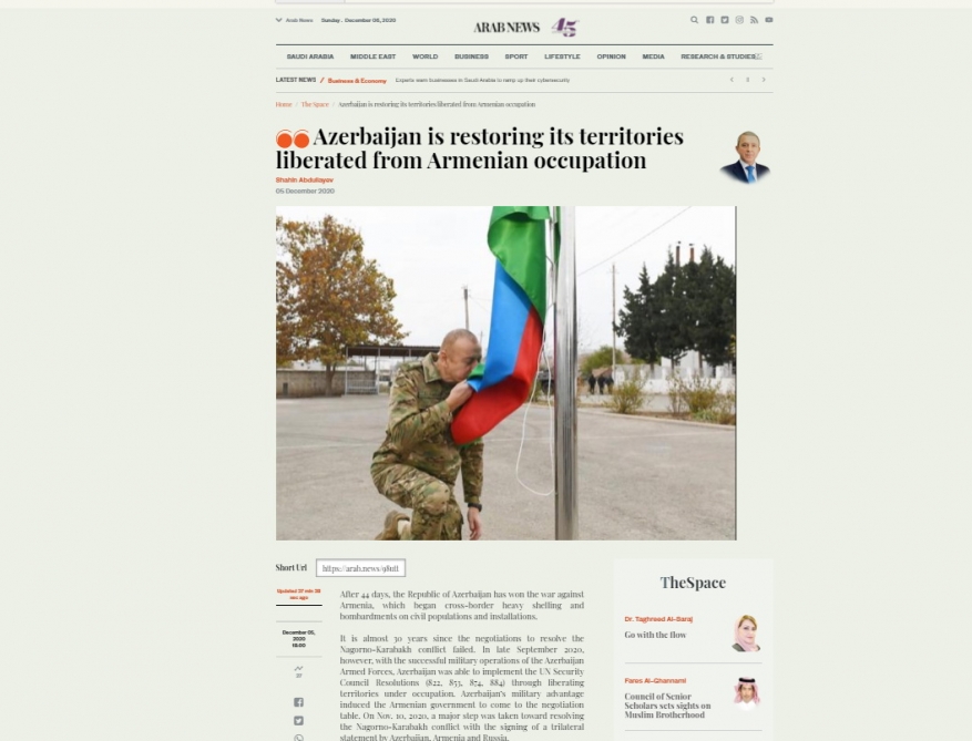 The Saudi Arabian Arab News newspaper has published an article by Azerbaijani Ambassador to the country Shahin Abdullayev headlined “Azerbaijan is restoring its territories liberated from Armenian occupation”.
