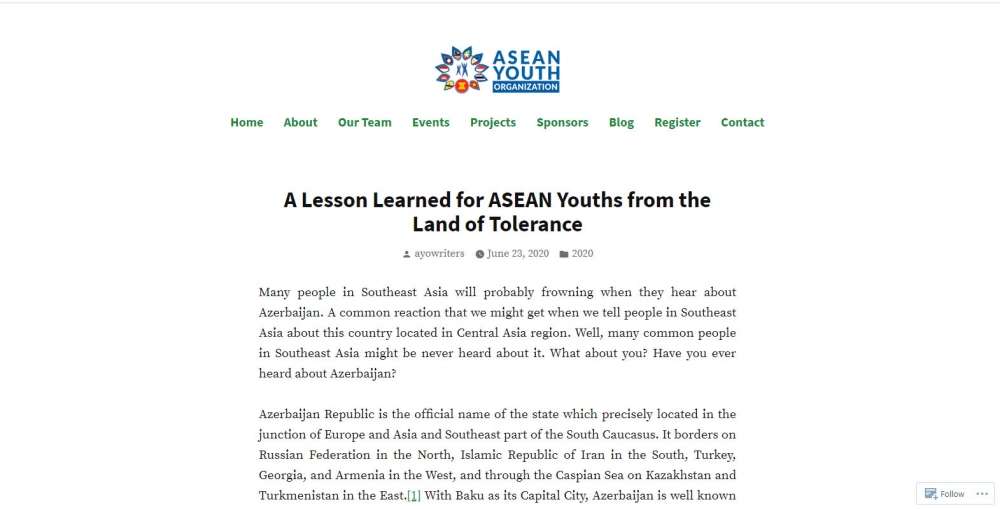 Written by Head of Project Development of ASEAN Youth Organization Handy Santoso, the article reads: " Many people in Southeast Asia will probably frowning when they hear about Azerbaijan. A common reaction that we might get when we tell people in Southeast Asia about this country located in Central Asia region. Well, many common people in Southeast Asia might be never heard about it. What about you? Have you ever heard about Azerbaijan?