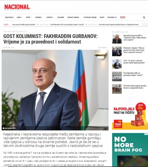 Zagreb, April 28, AZERTAC Croatia’s leading “Nacional” socio-political magazine has published an article by Azerbaijani ambassador to the country Fakhraddin Gurbanov titled “It is time for justice and solidarity”, highlighting Azerbaijan’s efforts to curb COVID-19 pandemic. Describing Coronavirus infection as a massive blow to the world’s political, social and economic development, the ambassador noted that Azerbaijan was one of the first countries that spared no efforts to confront the pandemic, as Extraordinary Summit of Turkic Council (April 2020), Online Summit of Non-Aligned Movement Contact Group (May 2020), as well as the Special Session of UN General Assembly in response to COVID-19 pandemic at the level of Heads of State and Government (December 2020) were all held on Azerbaijani President Ilham Aliyev`s initiative. “Moreover, Azerbaijan was one of the first states to join the COVAX initiative,” Gurbanov said. Touching upon Azerbaijan’s preventive measures against the spread of coronavirus infection, the ambassador noted that Azerbaijan joined the voluntary vaccination under the World Health Organization, as well as rendered humanitarian and financial aid to more than 30 countries. “Additionally, Azerbaijan supports the resolution adopted by UN Human Rights Council titled “Ensuring equal affordable, timely and universal access to vaccines in all countries in the fight against the coronavirus pandemic”, highlighting the equal distribution of vaccines to the world,” he added.
